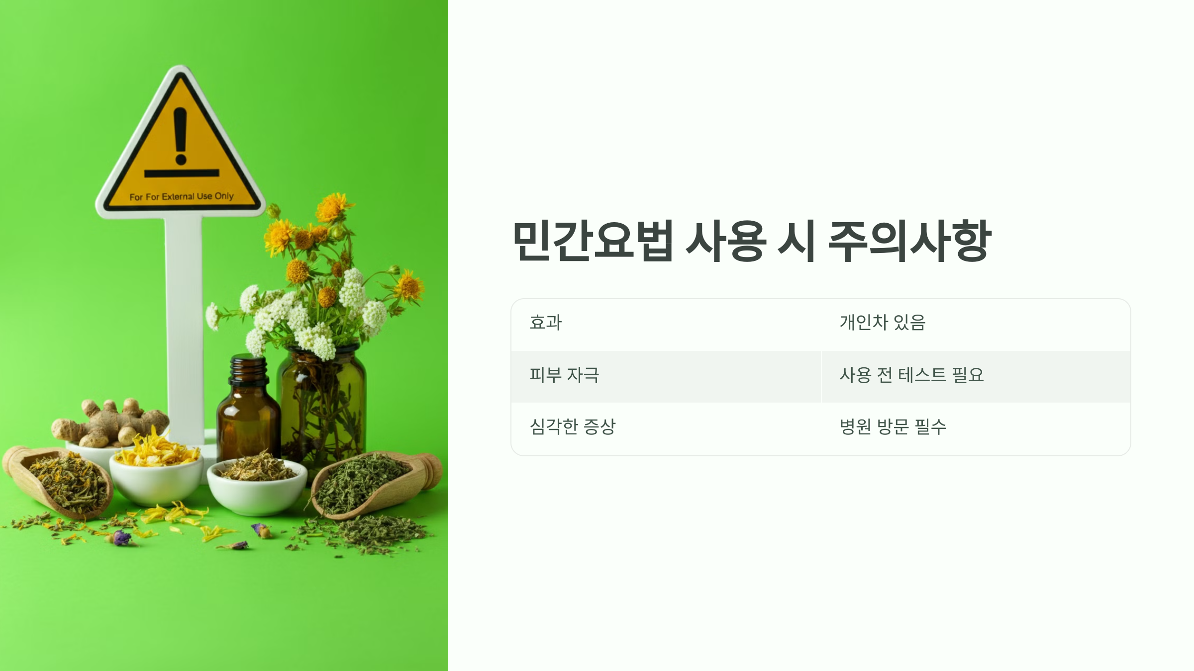 - 효과는 개인 차가 있어요. 민간요법은 증상을 완화하는 데 도움을 줄 수 있지만, 즉각적인 효과를 기대하기는 어려울 수 있습니다.