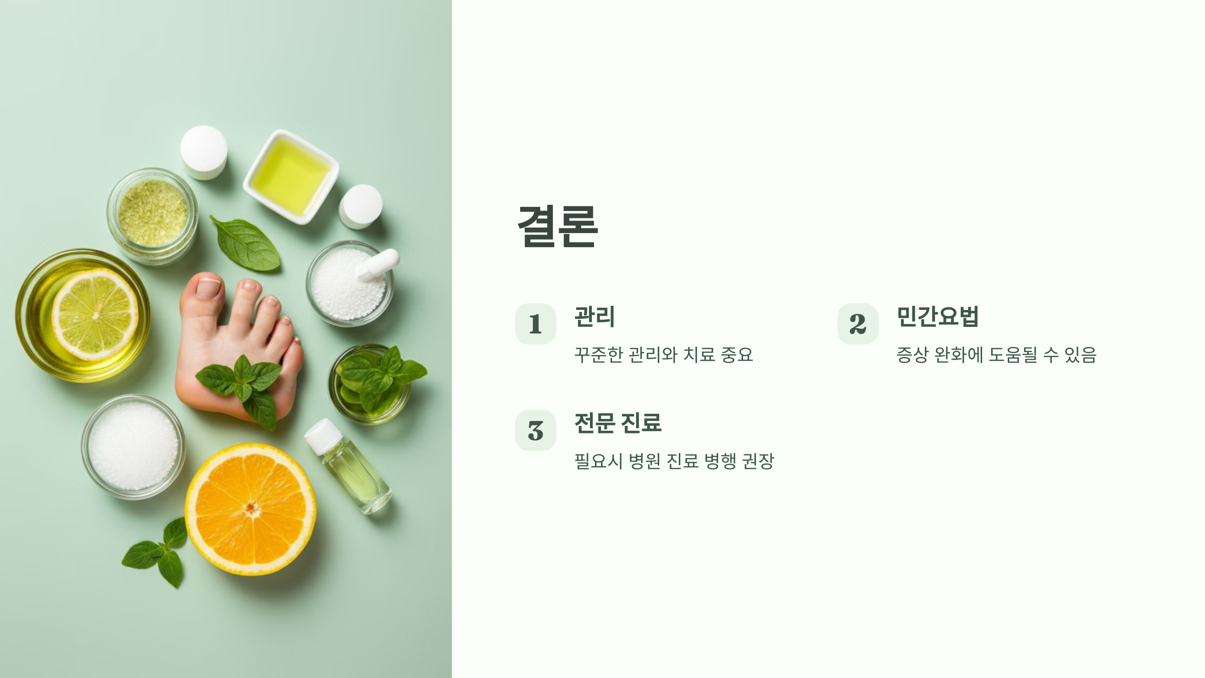 발톱 무좀은 꾸준한 관리와 치료가 중요해요. 식초, 티트리 오일, 마늘 등 민간요법을 활용하면 증상을 완화하고 건강한 발톱을 되찾는 데 도움이 될 수 있어요. 하지만 민간요법만으로 완전히 치료되지 않는 경우가 많으니, 필요하면 병원 진료도 병행하는 것이 가장 효과적이에요. 건강한 발톱을 위해 지금부터 실천해 보세요! 😊