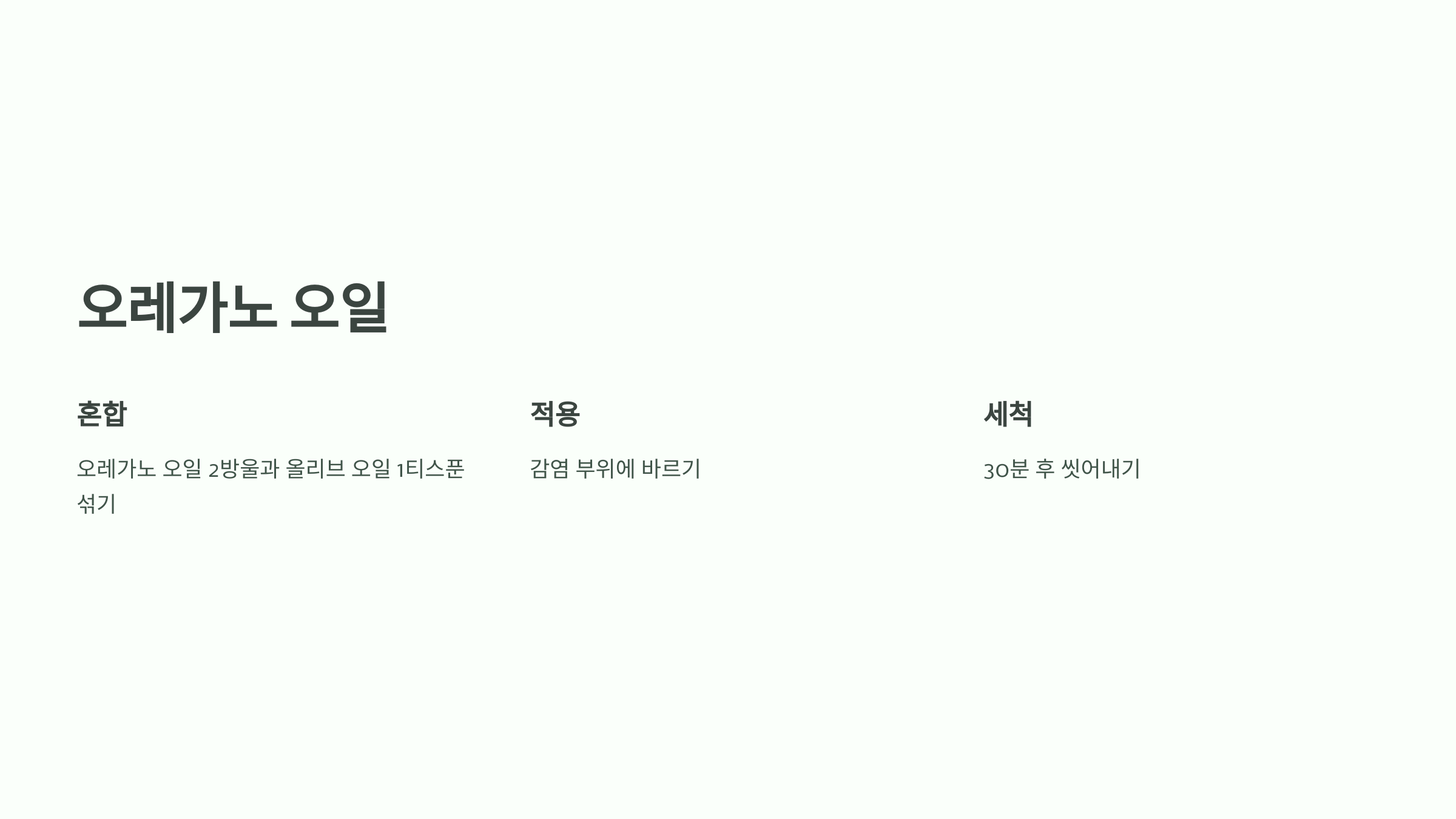 - 오레가노 오일 2방울을 올리브 오일 1티스푼과 섞어주세요.