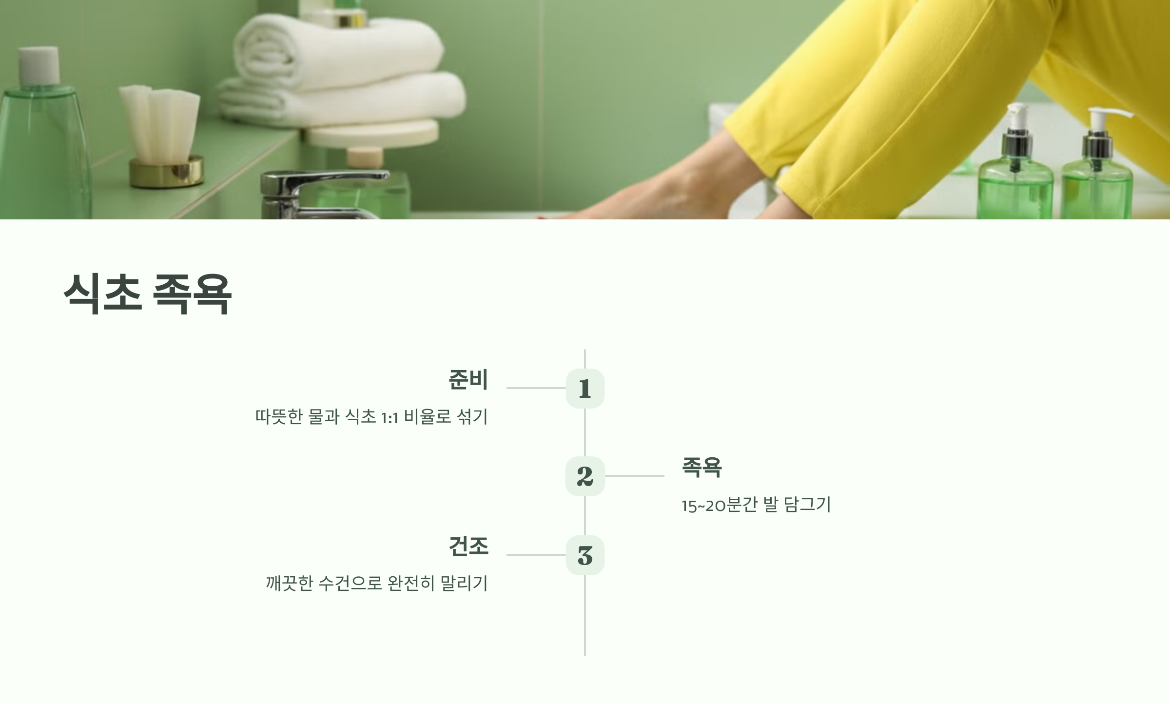 식초의 산성 성분은 곰팡이 성장을 억제해 무좀 증상 완화에 효과적이에요.