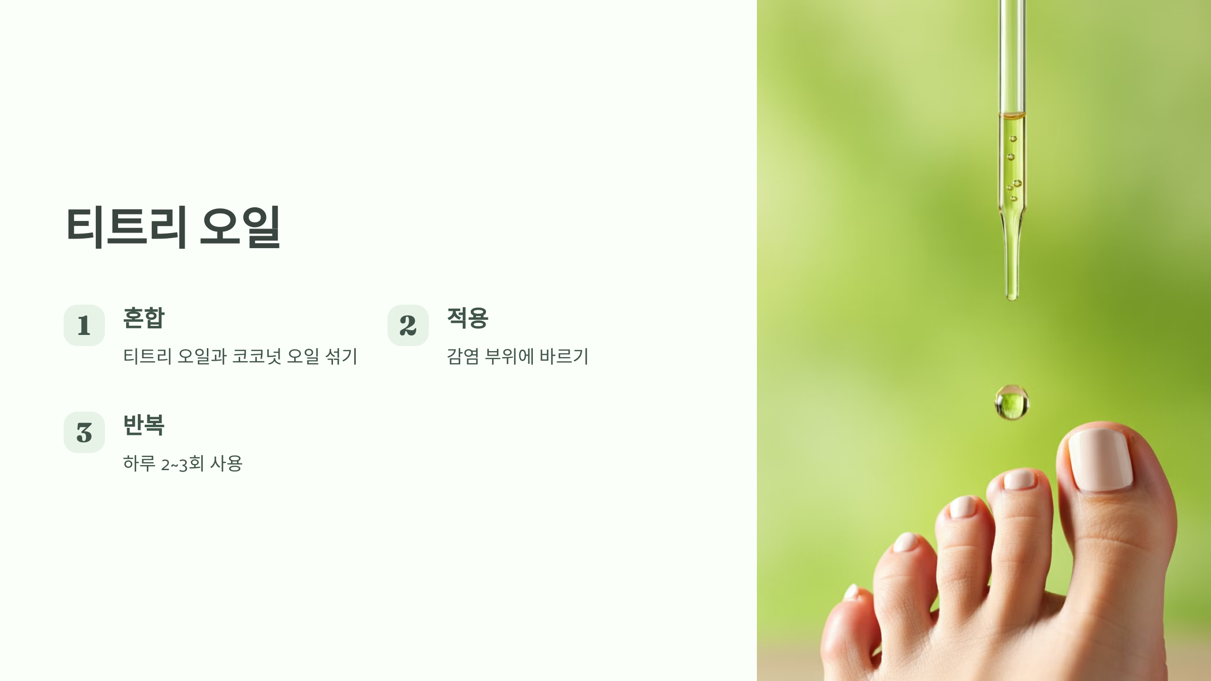티트리 오일은 강력한 항진균, 항균 작용이 있어 무좀 치료에 자주 활용됩니다. 단, 피부 자극을 피하기 위해 반드시 희석해서 사용하세요.
