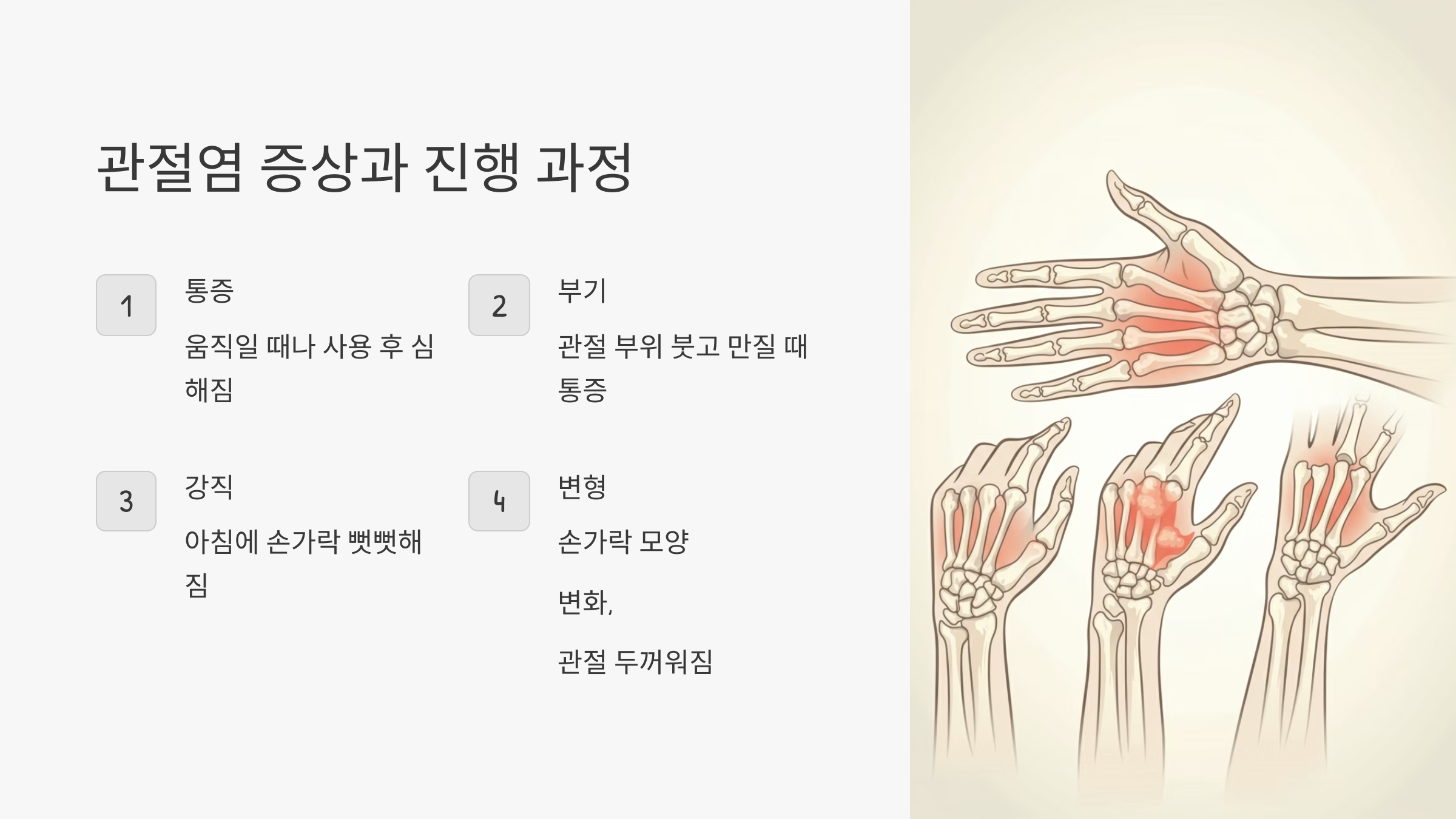 - 주요 증상: 손가락 중간 마디가 붓거나 아침에 관절이 뻣뻣해지는 강직 증상이 나타나요.