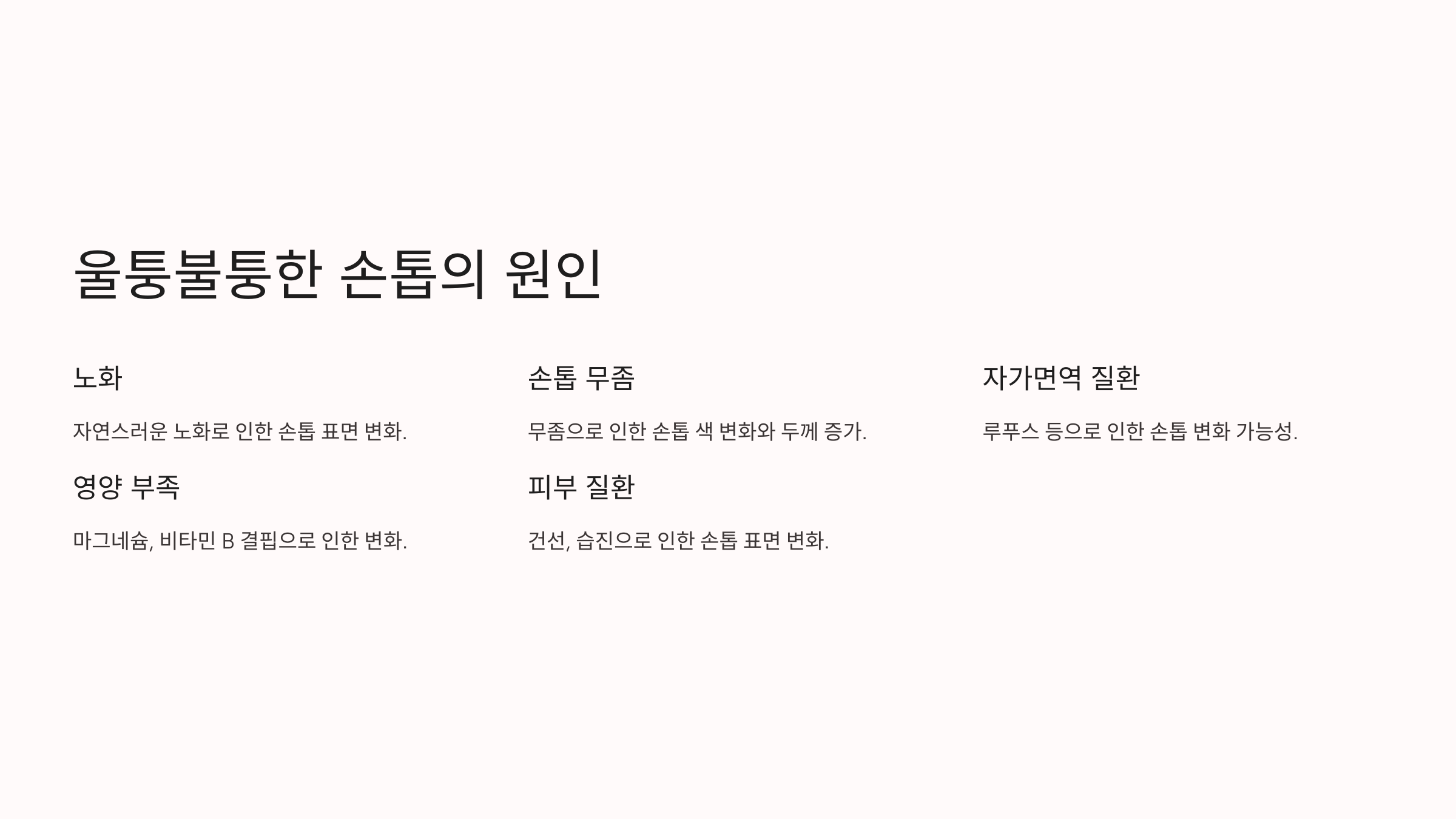 손톱이 울퉁불퉁해지는 것도 다양한 원인이 있어요. 간단히 살펴볼까요?