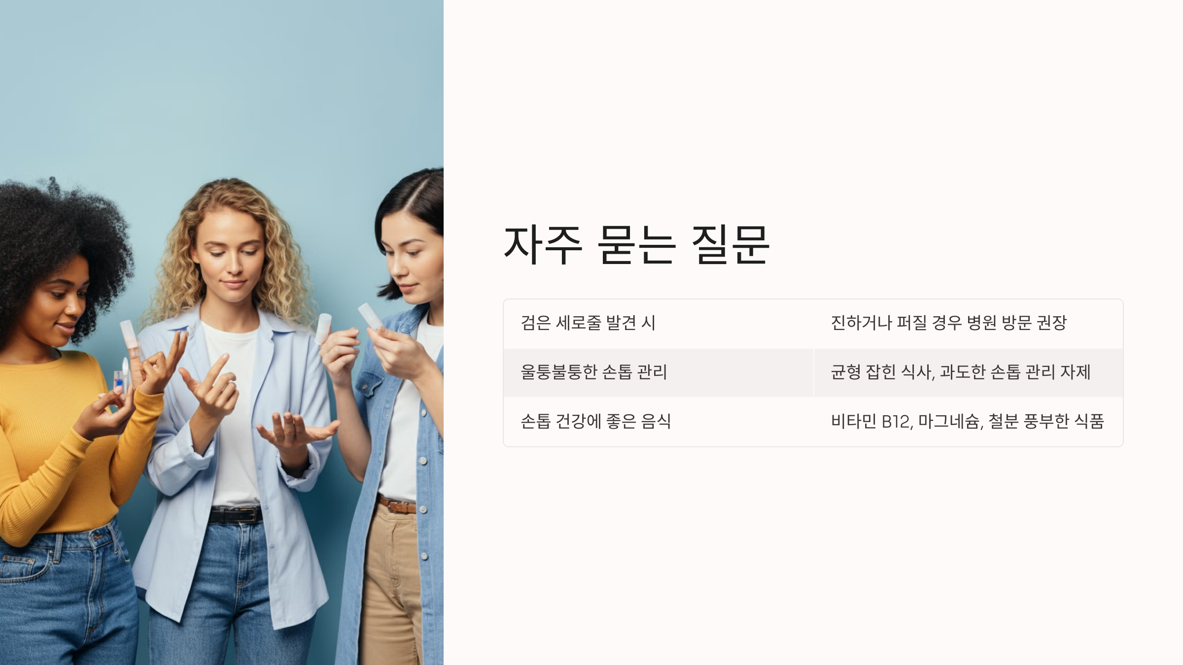 A: 균형 잡힌 식사를 하고, 손톱을 과도하게 다루지 않는 게 중요해요. 증상이 계속되면 병원 진료를 받는 게 좋아요.