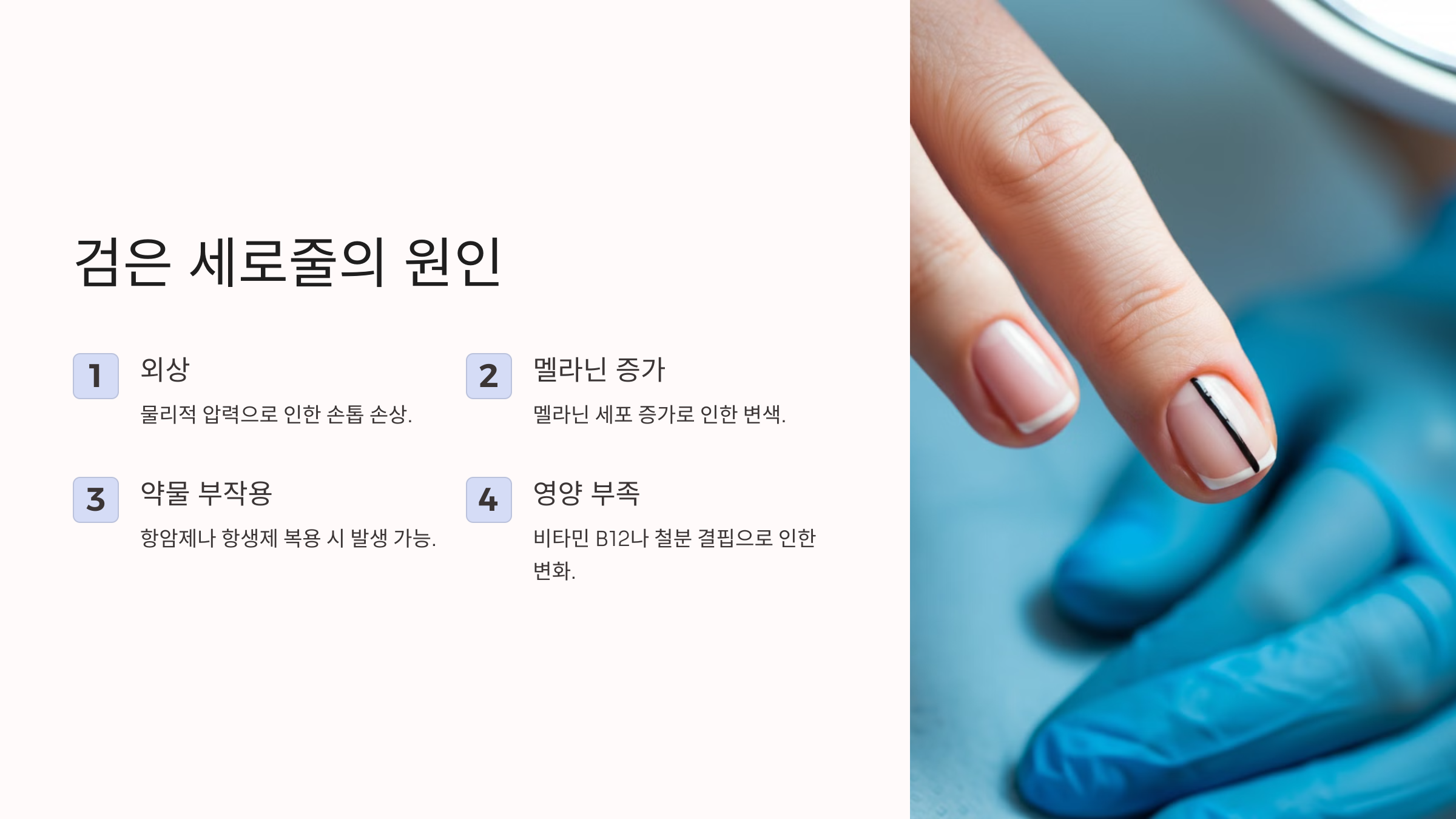 - 주의: 검은 줄이 점점 진해지거나 손톱 주변 피부로 퍼지면 흑색종일 가능성도 있으니 꼭 병원에 가보세요.