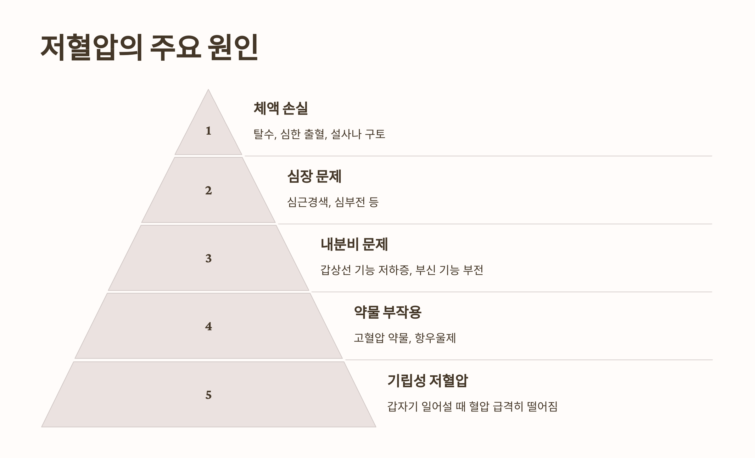저혈압은 다양한 원인으로 발생할 수 있는데요, 대표적인 원인을 정리해 봤어요: