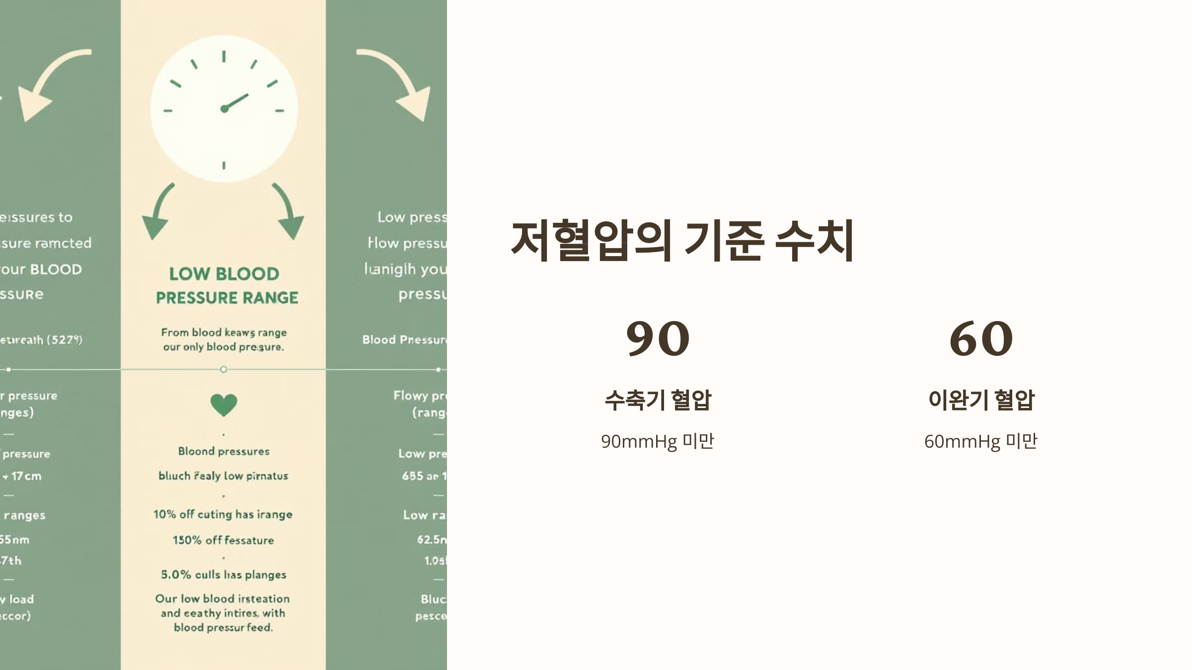 저혈압은 일반적으로 수축기 혈압 90mmHg 미만 또는 이완기 혈압 60mmHg 미만으로 정의돼요. 하지만 개인에 따라 정상 혈압의 범위가 다를 수 있답니다. 특히 평소 저혈압 증상이 없던 분이 갑자기 혈압이 낮아진다면 주의가 필요해요. 정기적인 혈압 측정을 통해 자신의 평균 혈압을 파악해 두는 게 중요해요.